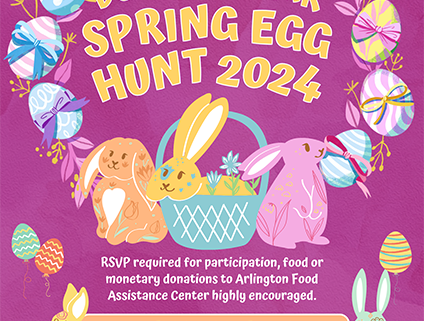 We are asking families to bring a food donation for the Arlington Food Assistance Center, or families can make a monetary donation to AFAC at the event. Please bring your own bag to hold eggs during the egg hunt. Please remember to return the empty eggs as they exit the event so we can re-use them next year. We are also in need of volunteers, so please sign up to set up, help out with the Easter Bunny and egg hunts, and clean up. In the event of spring showers, we will reschedule the event for the following Saturday April 7th.